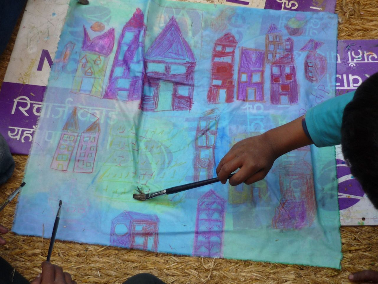 For the next stage of the Paul Klee inspired project the Art Centre children work in small groups drawing shapes with crayon onto square pieces of fabric. Fabric is more durable than paper, and as we expect these pictures to be beautiful, we want to put them onto a good surface so they may be displayed and appreciated for a long time.