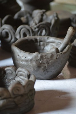 I was delighted to see the children at the art centre bring their full attention to our first clay project together – mask making. It was the first time we had seen everyone in the group immersed in their project and also the first time we had seen most of the children take an idea and make it their own without copying from my demonstration piece or from eachother. It felt like a turning point. Subsequently I showed them how to create a coil pot and as each child had nearly completed theirs, I showed them some decorating techniques. We saw a wonderful collection of pots emerge – with lids, chopsticks, flowers and decorations – and in all sorts of shapes and sizes.