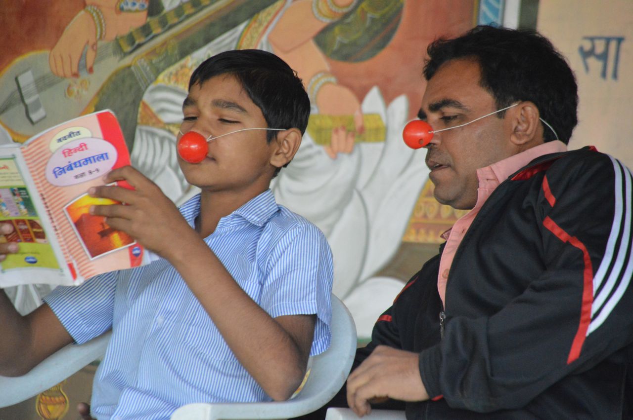 School teacher Tariq Malik clowning with student in Jainabad village school Gujarat