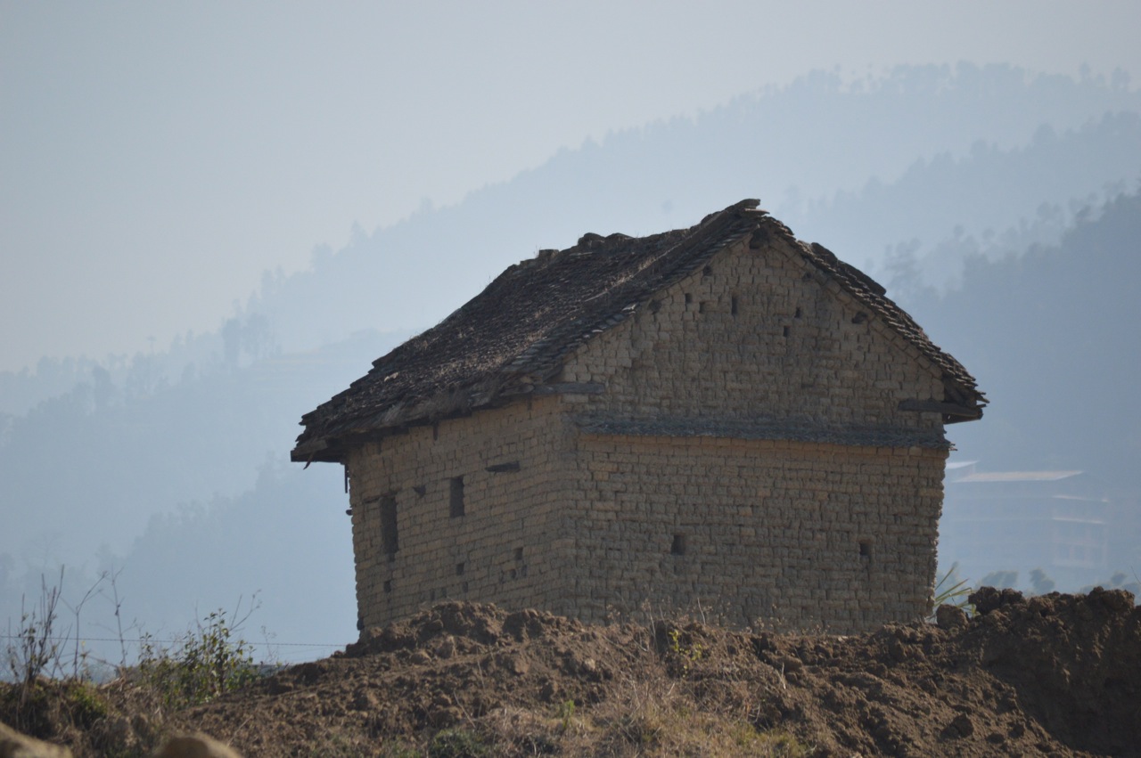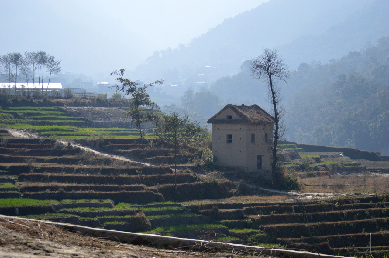 2015 (before earthquake) : buildings sitting in the terraces built into the land around Bhaktapur Nepal. Terracing helps farmers overcome the steep terrain and also control water supplies to the crops. There are many pathways that criss-cross the farms; we love wandering around them, watching the farm life, smelling the earthy scents of the cows and buffalo, hearing the screeches of the chickens and constant barking of dogs. Well not so much the barking. We watch in awe at the physical strength of the Nepalis as they undertake farm life with few implements or machines. In winter, the colours are soft and misty, although the days are bright.