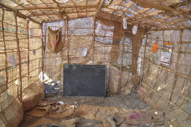 The school is a hut. It is about 2.0 m x 3.0 metres maybe, and constructed of bamboo and recycled hessian sacks sewn together by hand and string. The floor is rocky, earthen and hard; a few sacks are scattered across it in a minimal concession to comfort. At the entrance, a sign tells us that this is an official government school for the salt children. Yet inside there are none of the resources that should be provided to it. There is one blackboard; the rest, we understand, has been siphoned off by corrupt officials.