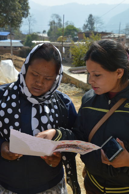Nimala KC (from UEMS) reads the letter with a youth volunteer from Jhanuwarashi