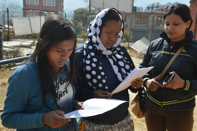 A teacher from Navojyoti School, Jhanuwarashi volunteer and Nirmala from UEMS with the letters from MGIS