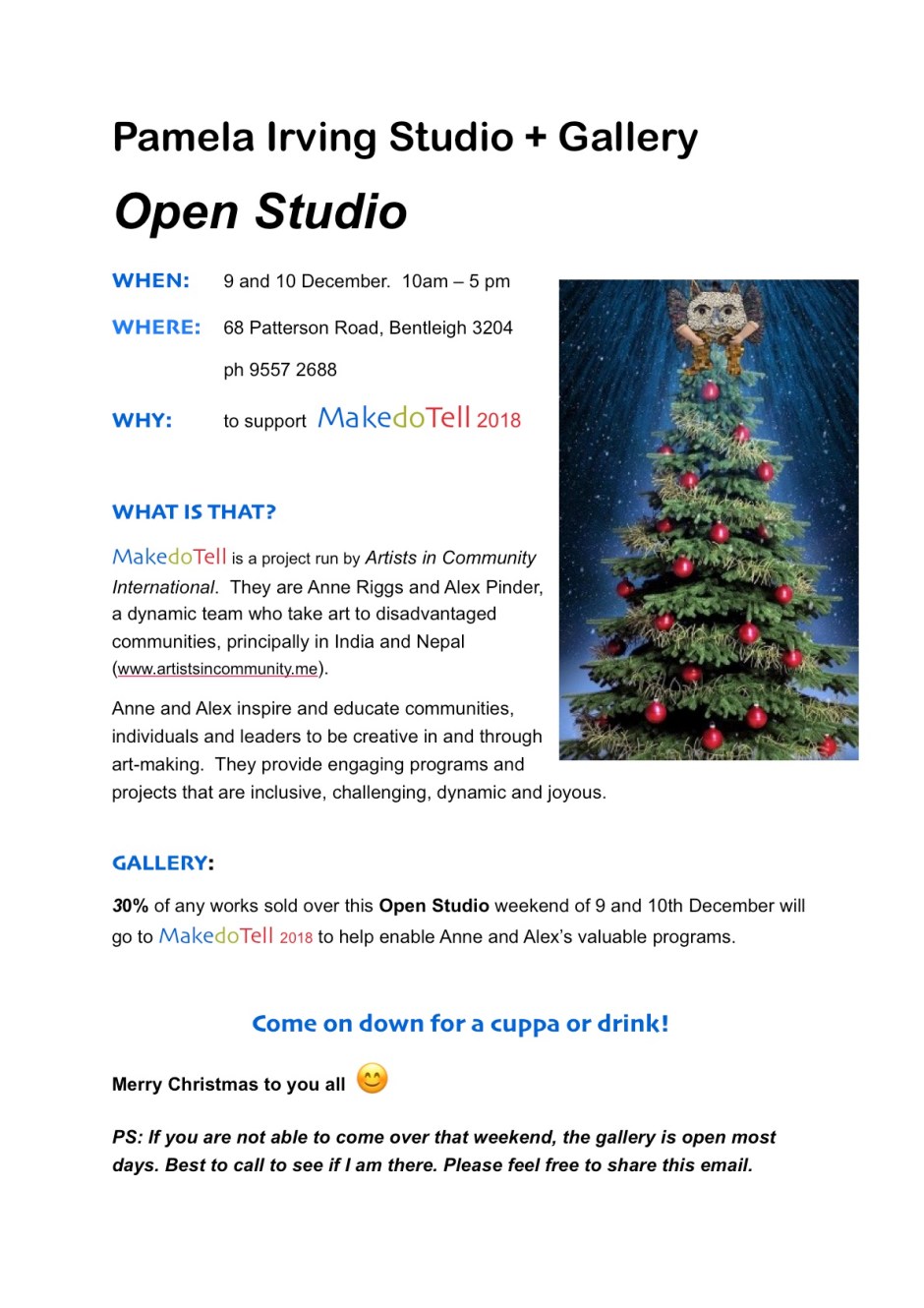 > ARTISTS in COMMUNITY International posted: “Fabulous artist and our friend > Pamela Irving is having an open day at her Studio + Gallery in Bentleigh on > 9-10 December. 30% of sales from that weekend will be donated to support > Make Do Tell 2018. Pamela Irving is a renowned artist – you have probab” >